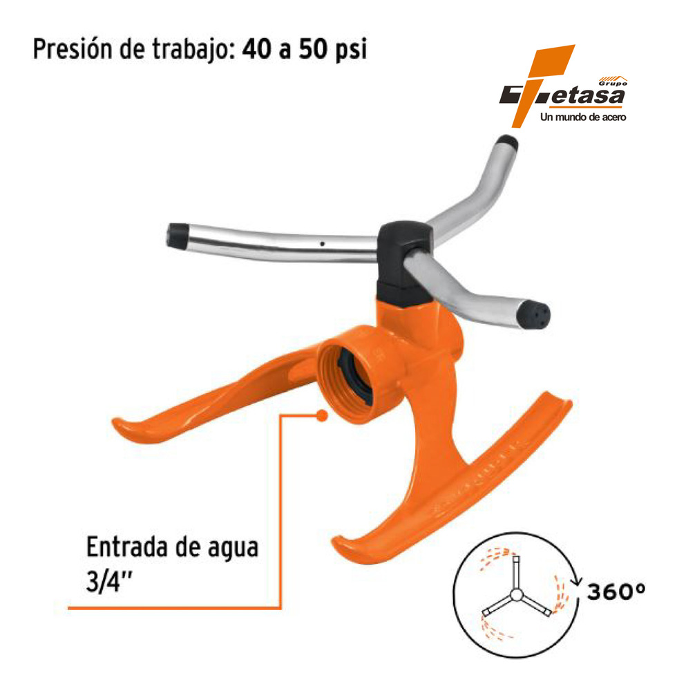 Los tres brazos de este aspersor están fabricados en aluminio resistente, garantizando su durabilidad y eficiencia a largo plazo. A pesar de su robustez, este aspersor giratorio Truper es notablemente ligero, lo que facilita su movilidad y manejo. Una característica destacada de este producto es su capacidad para funcionar uniformemente incluso a baja presión, lo que lo hace ideal para cualquier tipo de jardín o césped.