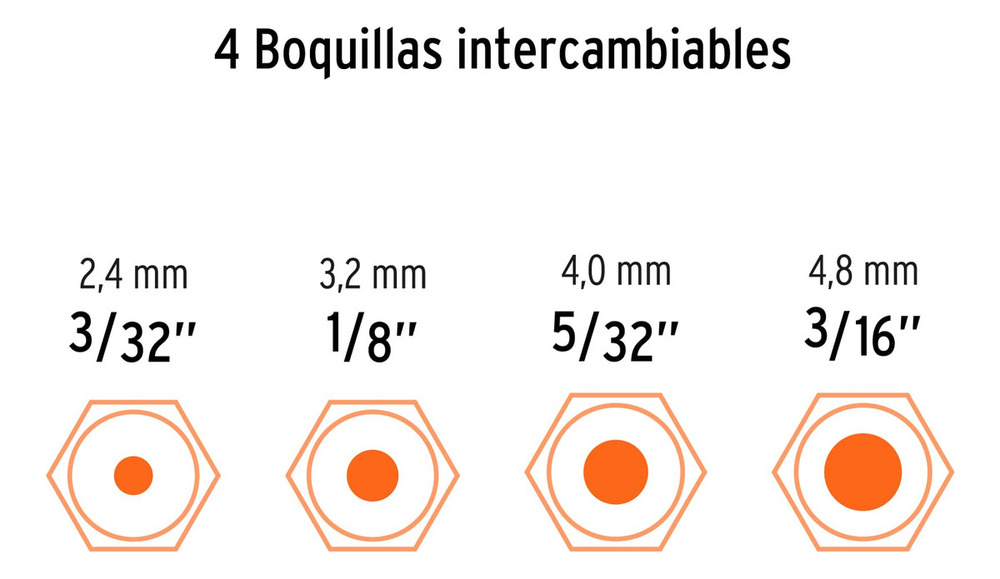 • Incluye 4 boquillas intercambiables: 3/32″ (2.4mm), 1/8″ (3.2mm), 5/32″ (4mm) y 3/16″ (4.8mm)
